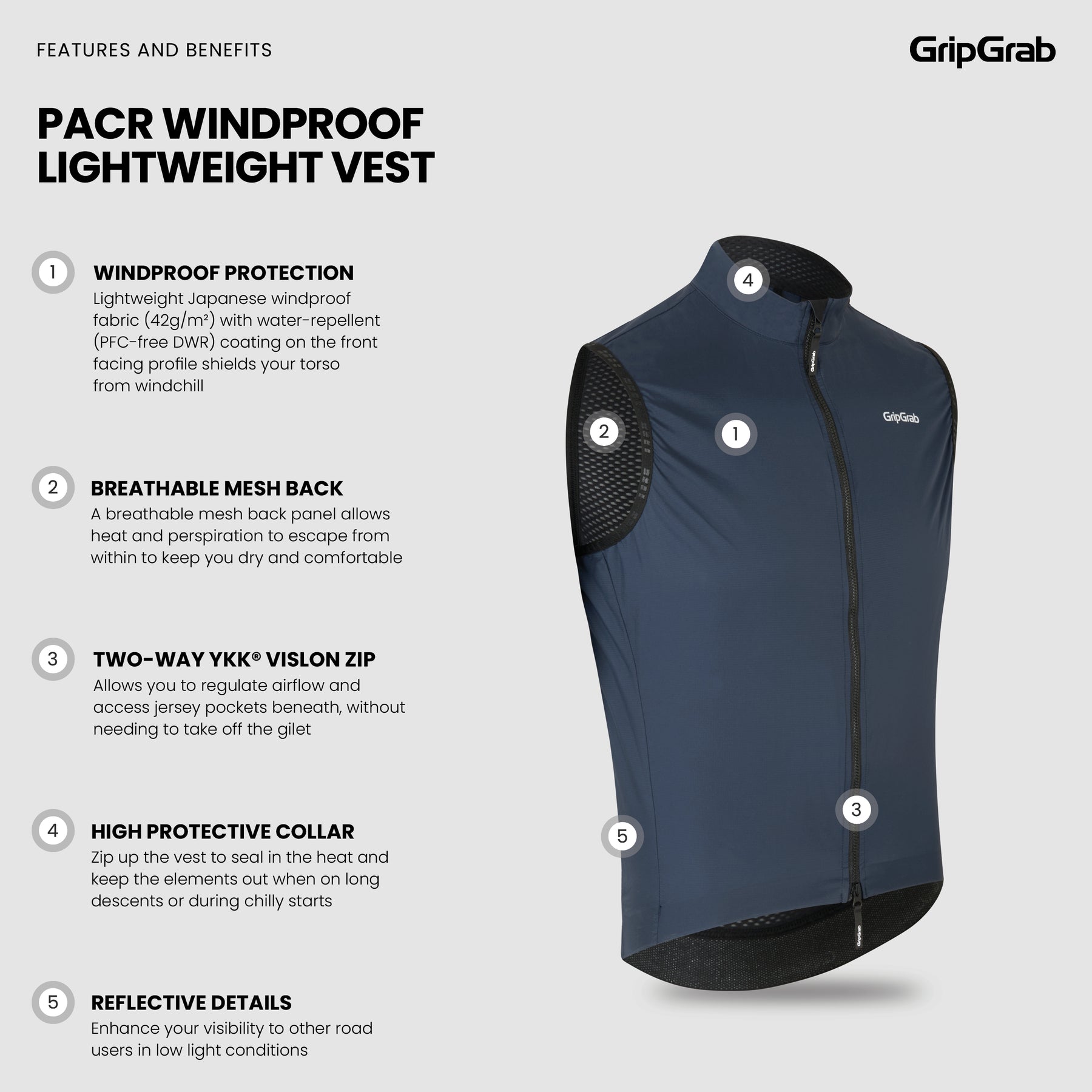 Does the PACR gilet have any pockets? No, it does not have any pockets to keep it as lightweight and packable as possible. You can easily access your jersey pockets thanks to the 2-way-zip. How is this vest intended to be worn? You wear this windproof vest on top of your short or long sleeve cycling jersey. It is not intended to be worn as a sleeveless bike shirt without a jersey underneath. Which conditions is the PACR Windproof Vest made for? This lightweight windproof cycling gilet can be used throughout the entire year to shield your upper body from wind. Use it in spring and summer with a short sleeve jersey to protect yourself on windy days and keep warm on fast descents. Wear it on top of your thermal long sleeve jersey in spring and autumn to fend off the wind.