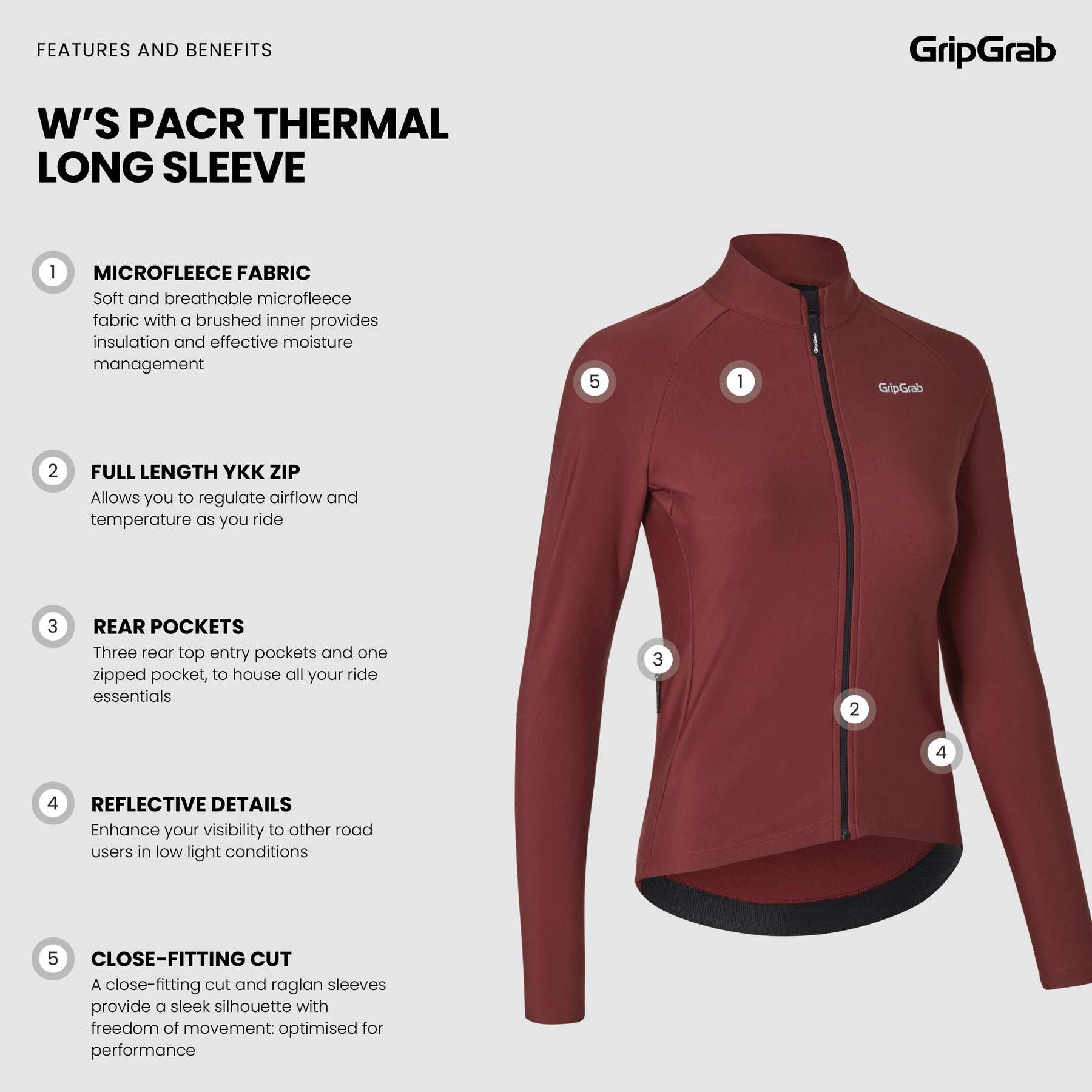 Is this jersey suitable for deep winter cycling? Is it a winter jacket? The GripGrab PACR Thermal Long Sleeve Jersey is not a winter jacket and is not suitable for deep winter cycling when worn on its own. We recommend this jersey for the transition seasons of spring and autumn. How thick is the PACR jersey? Being a thermal jersey for spring and autumn, this jersey is thicker than a lightweight short-sleeve summer jersey but thinner than a winter jacket. Which products should I combine this thermal jersey with? What should I wear underneath? If you need to wear this jersey, it will most likely be cold enough to also wear leg warmers, thermal full-finger gloves, and a headband. We recommend wearing a (windbreaker) thermal base layer underneath or a windproof gilet on top. How does this PACR Thermal Long Sleeve Jersey differ from the PACR Long Sleeve Jersey? The PACR LS Jersey is significantly thinner and lighter than this Thermal version. The PACR LS Jersey is designed for those early morning or late evening rides where the temperatures demand for more than a short sleeve Jersey, whereas this PACR Thermal LS Jersey is a dedicated spring and autumn jersey that offers more thermal insulation.